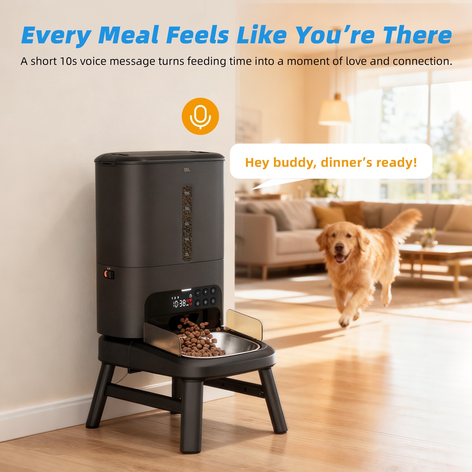 Stay connected even when you are not around. Record a 10-second voice message that plays automatically at feeding time, offering comfort and familiarity to your dog.