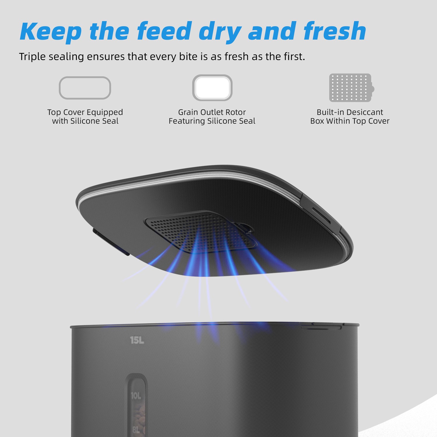 The Tikpaws 15L Automatic Pet Feeder features an ultra-large 15L food container, capable of holding up to 16 lbs of dry kibble—enough for 14 days of feeding. It is perfect for busy pet parents or families with multiple dogs or large breeds, keeping your pets well-fed even when you are away.