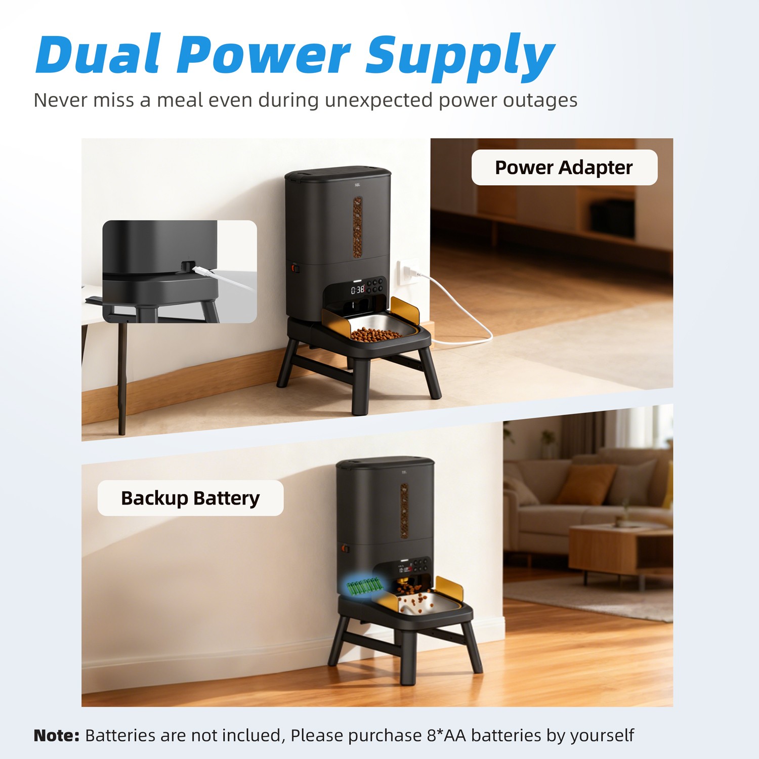Operate the feeder with the power adapter or 8 AA backup batteries (not included). Dual power ensures continuous feeding and peace of mind during power outages.